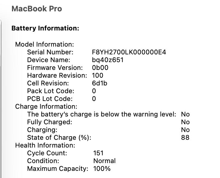 * Battery: Only 151 cycles (excellent health).