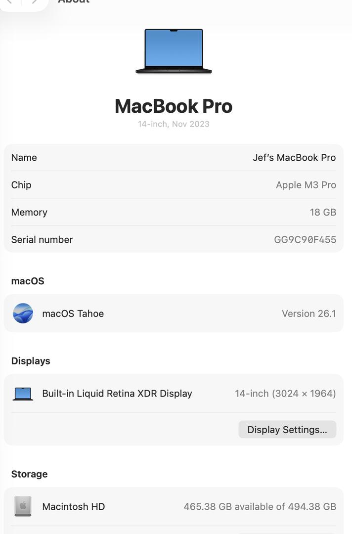 * Specs: 14.2" Liquid Retina XDR Display, 18GB RAM, 512GB SSD.