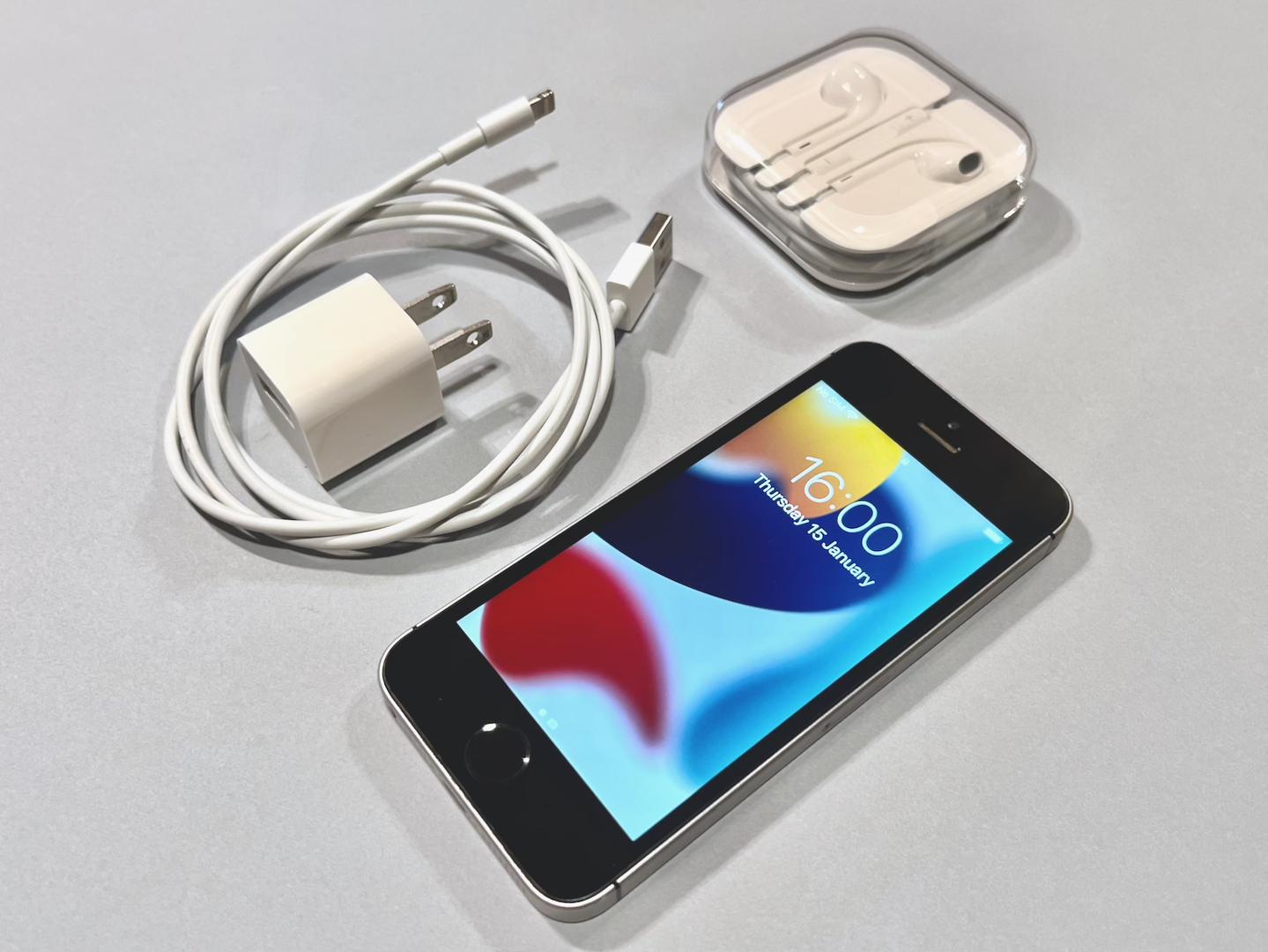 Comes complete with original charger, Lightning cord, and headphones. The headphones are unused, still factory sealed in the original case.