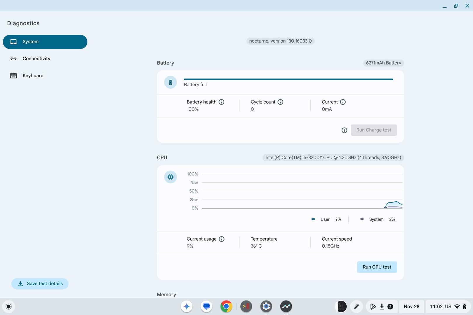 Battery has only 0 cycle which indicates the battery has been used approximately few days after out of the box. Battery health is perfect at 100%. Serial number: 0563. Battery count is the same as mileages of a car; based on the count, you can make an educated guess how long it has been used. Be aware of buying a Pixel Slate without information of battery as you may buy one that reaches the end of its life such as over 300 battery cycles.