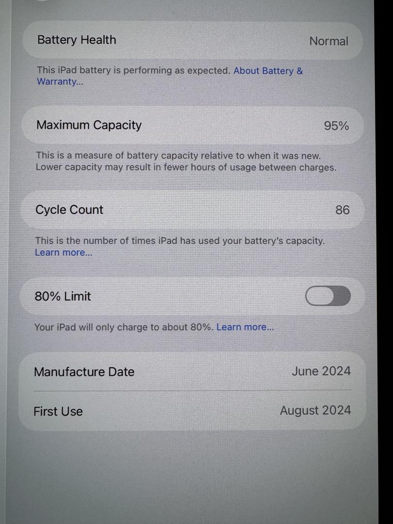 11 inch wifi only, 95% battery life, 86 cycles, 256 GB memory. Retail box, charger & cord. Model A2836.