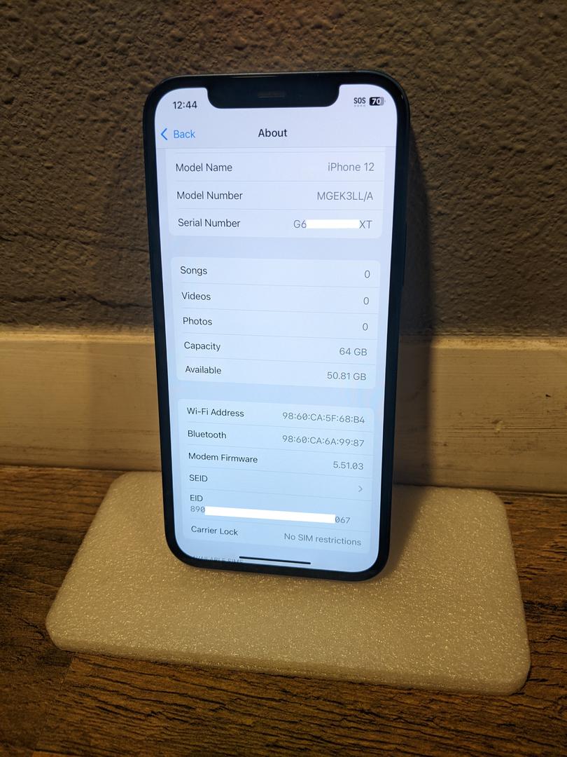 This iPhone 12 is in great condition. It is unlocked for use on any compatible carrier (aka no SIM restrictions). It has all original, OEM parts; nothing has been replaced.