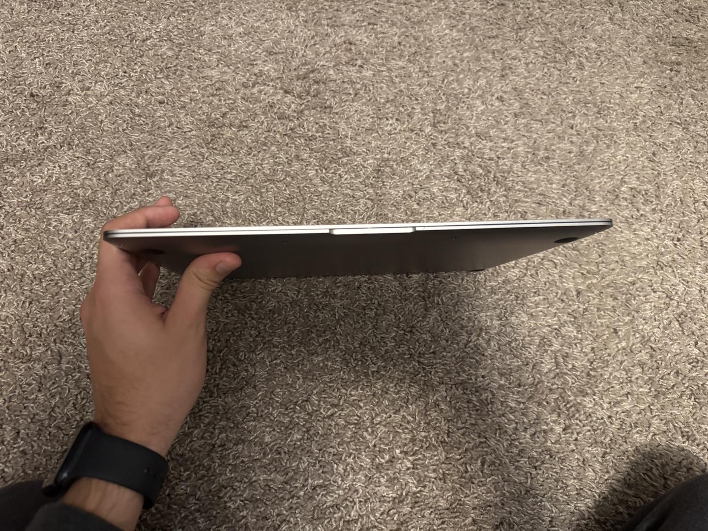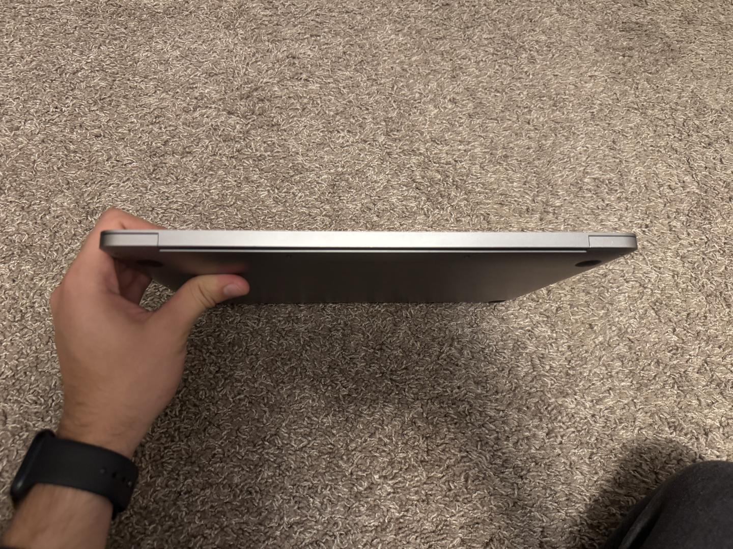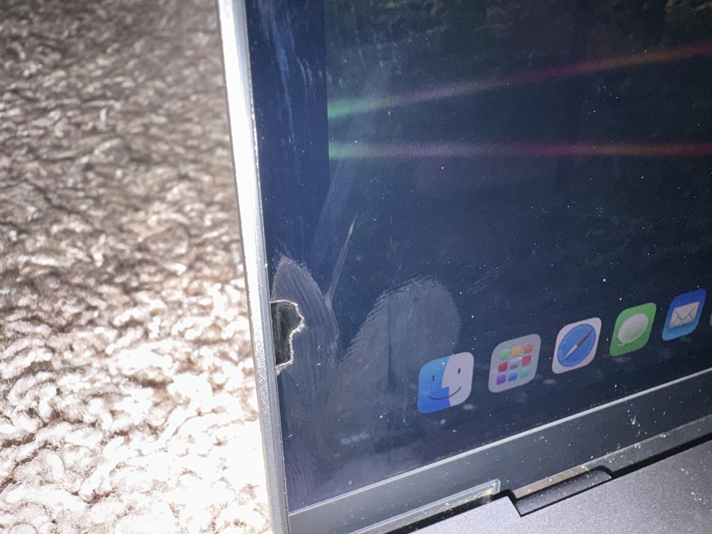 Small imperfection on the left bezel; scratches on the bottom of the laptop, and a brand logo on the lid