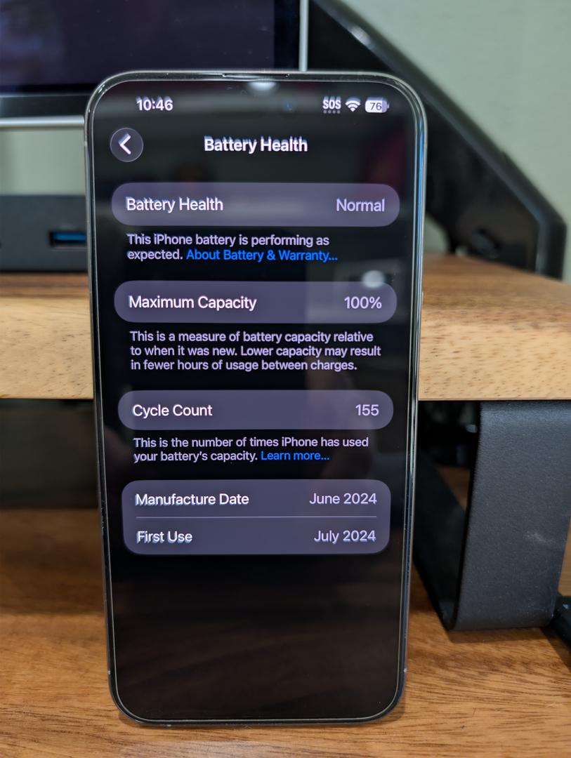 - Battery Health: 100% Maximum Capacity (Normal status)