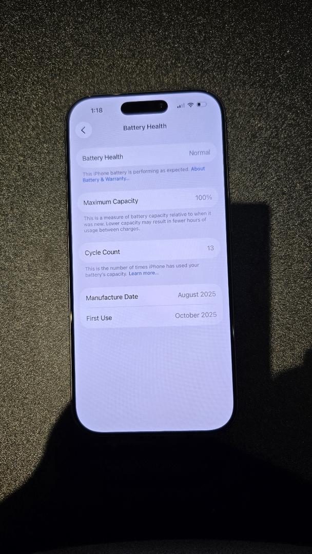 Battery: Peak performance with 100% Maximum Capacity and a very low cycle count of only 13 cycles.