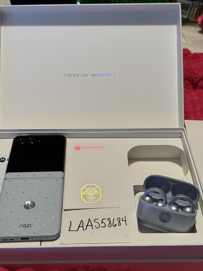 • Complete Collector’s Bundle: This listing includes the matching Moto Buds Loop (also encrusted with crystals) and the color-coordinated crossbody carrying case—all in the original "Crystals by Swarovski" display box.