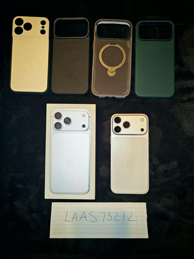 iPhone 17 Pro Max in excellent condition. Always had a privacy screen protector and a case on device, specifically the benks case listed in the post. There are two miniscule marks on the top left side of the phone (seen in photo) from taking on and off the benks case, but it is very small and unnoticeable unless you look for it (it's not a scratch or gash or dent or anything like that, as the device has never been dropped before). The device hasn't really had much use since I went back to my android device. Cases come with purchase: Dbrand grip case ($60 value), benks Armor air Aramid Fiber case ($40 value), TORRAS Ostand Q3 Air case ($66 value), silicone Amazon case. Original box included and original charger in box which has never been used yet.