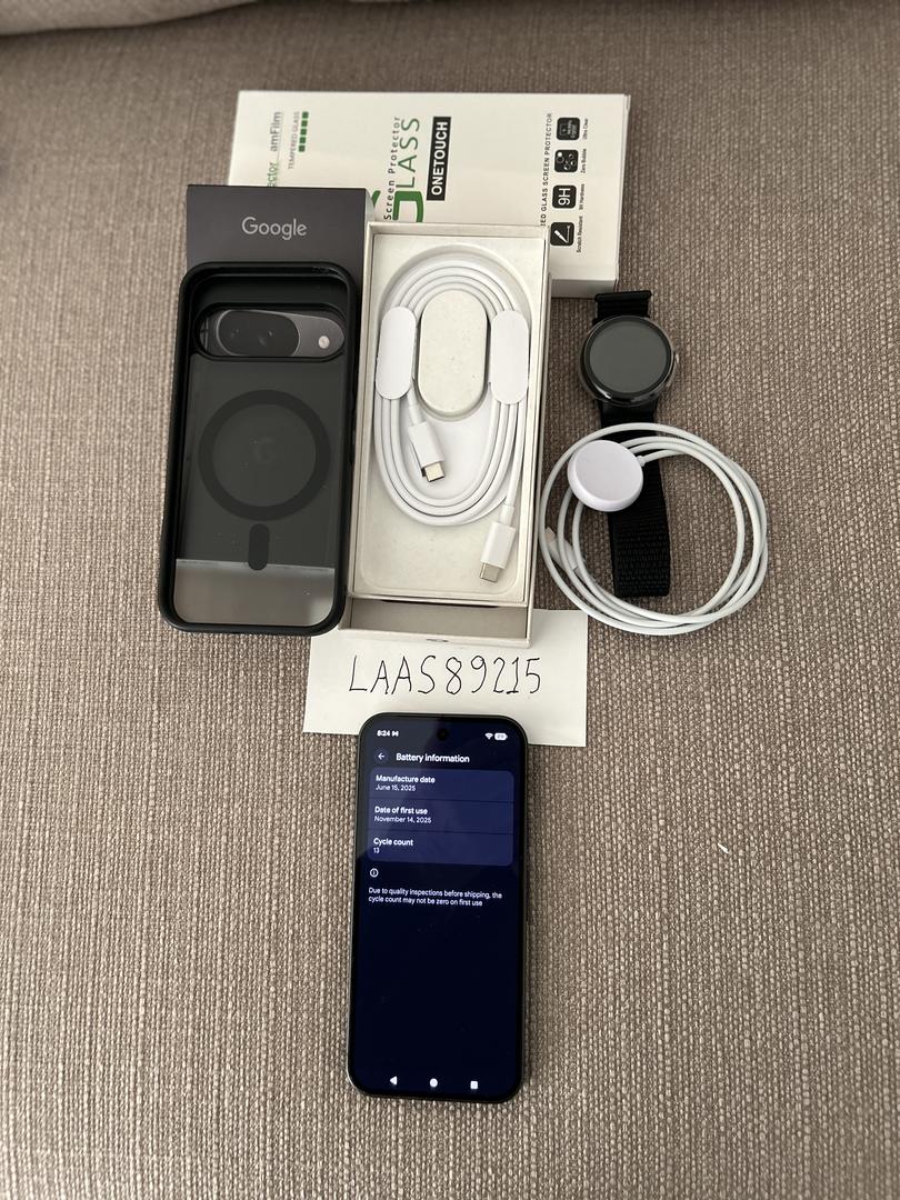 Tempered Glass Screen protector, magsafe-type case, pixel 1 watch, cable, box