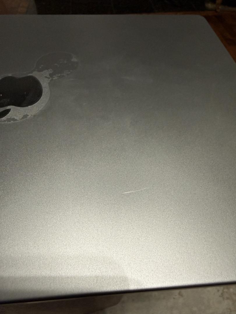 Sticker adhesive on the Apple logo. Small scratch on front case. Wear on the keyboard