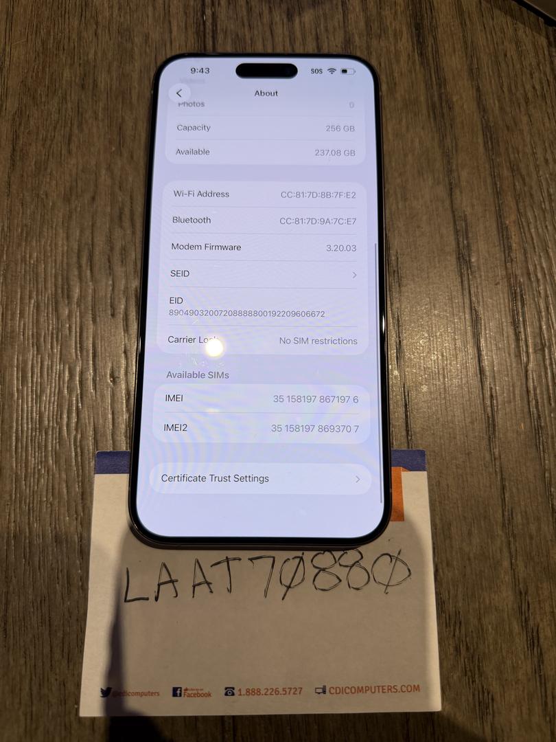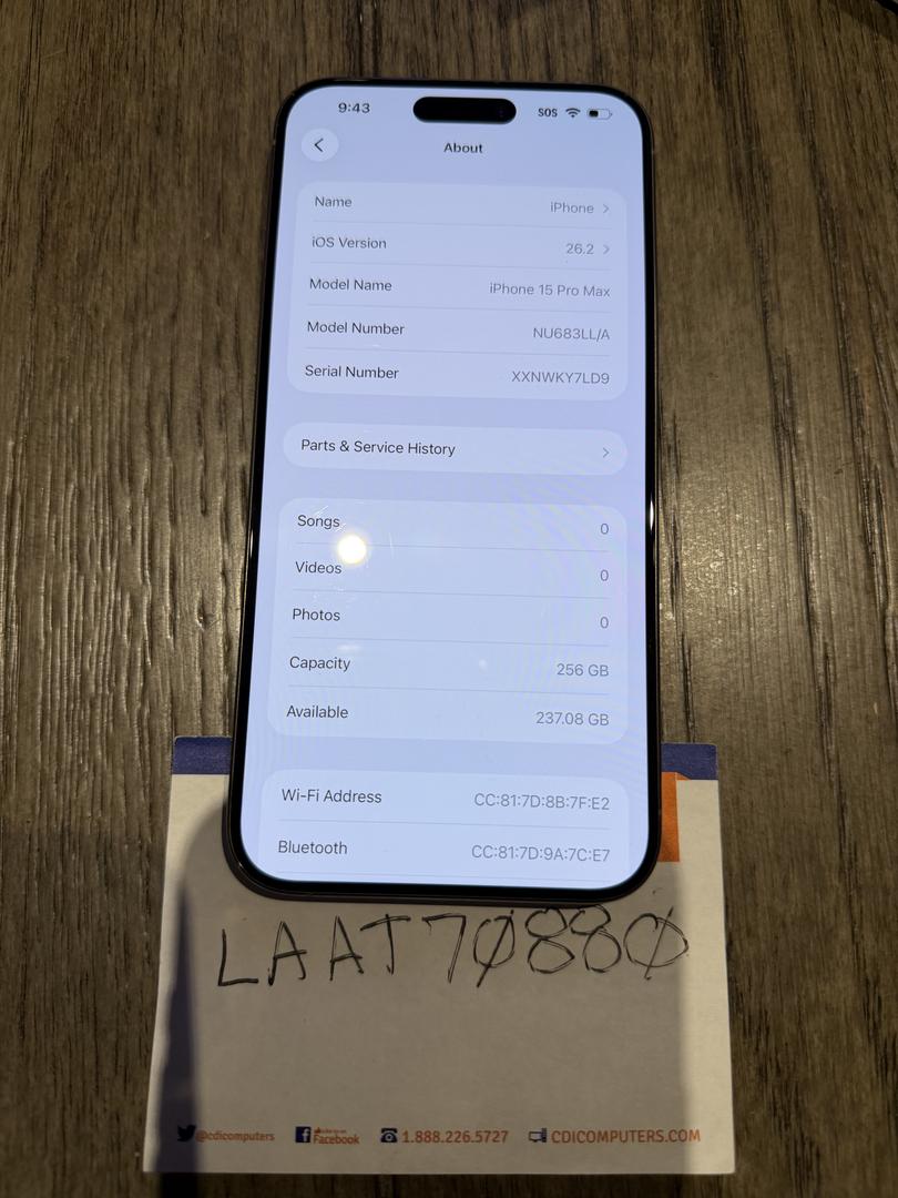 elling an iPhone 15 Pro Max, 256GB, Gray Titanium, factory unlocked. Limited Warranty through April 2026.