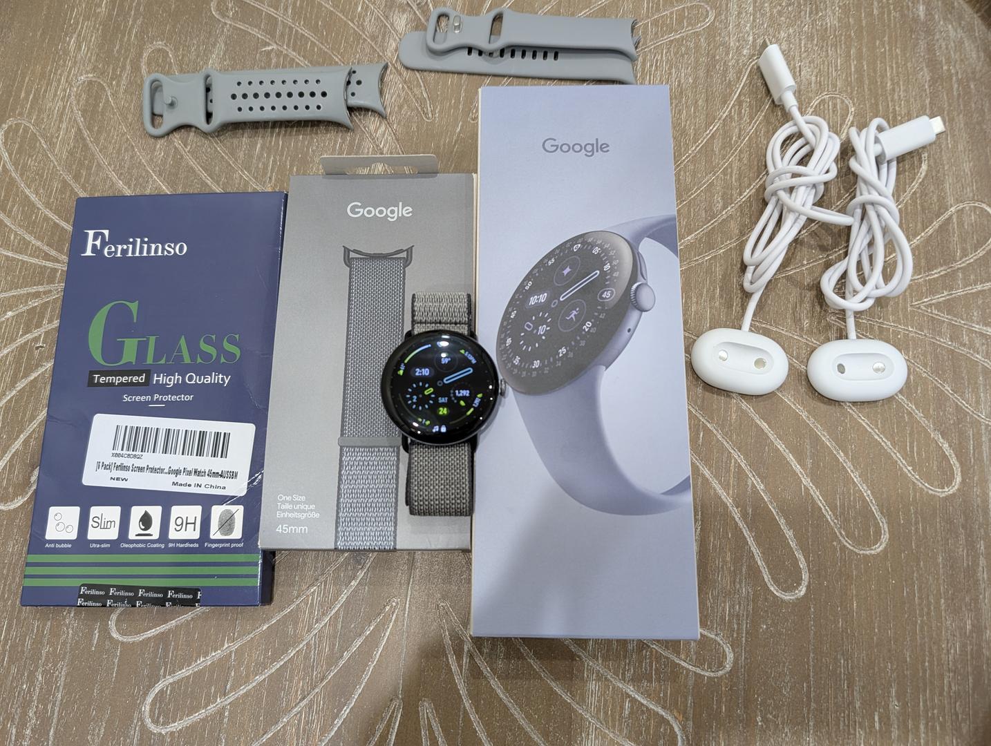 I love this watch and it's in perfect condition. I just find myself using my ring fitness tracker more often. This comes with two extra Google bands and chargers. Also included are a few extra screen protectors.