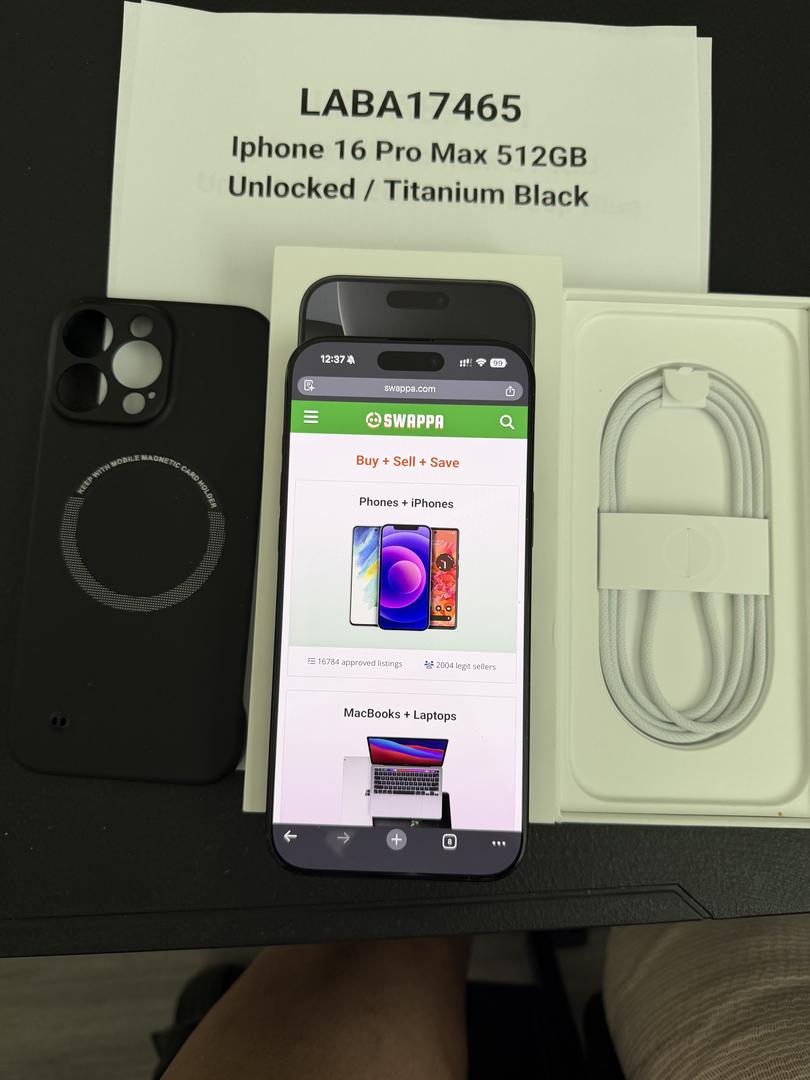 Mint! Apple iPhone 16 Pro Max (100% Battery/512 GB) in stunning Black!!!! + OEM Box/USB C Cable!! Also including black case!!!!
