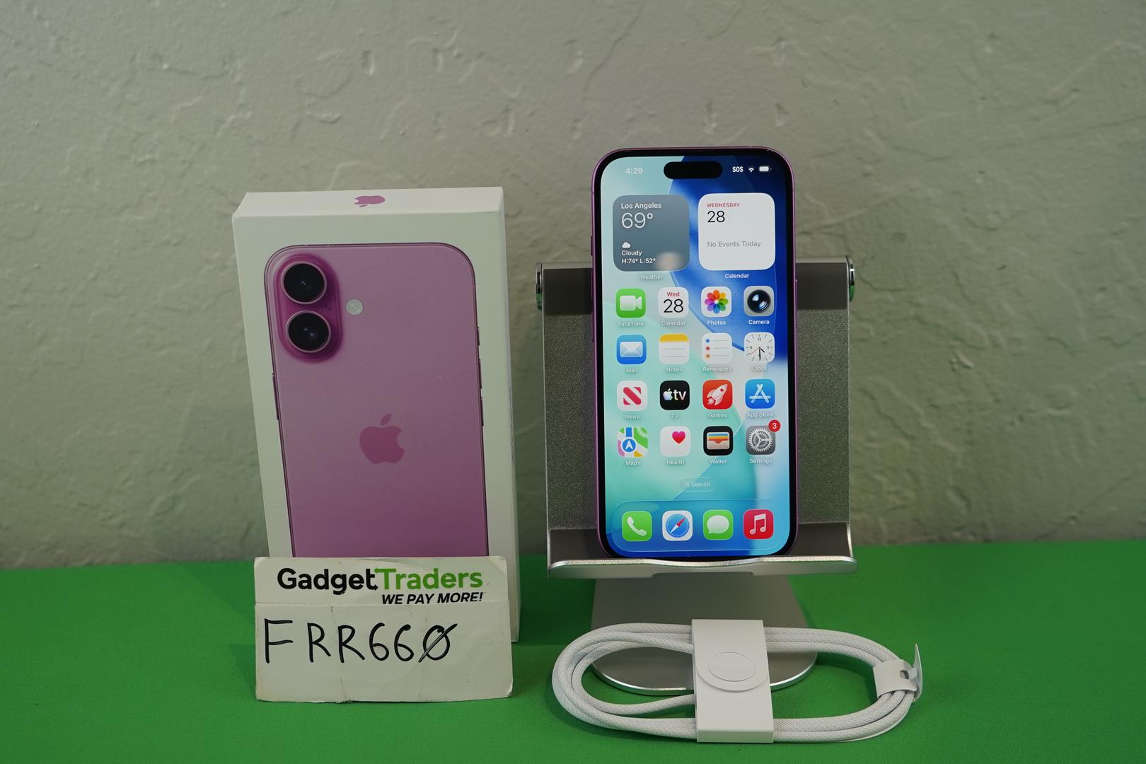 Apple iPhone 16 A3081 128GB Pink Sprint/T-Mobile 100% batt! its used and in mint condition no flaws on the screen or frame battery is at 100% with only 71 cycles comes with the original box and unused oem cable