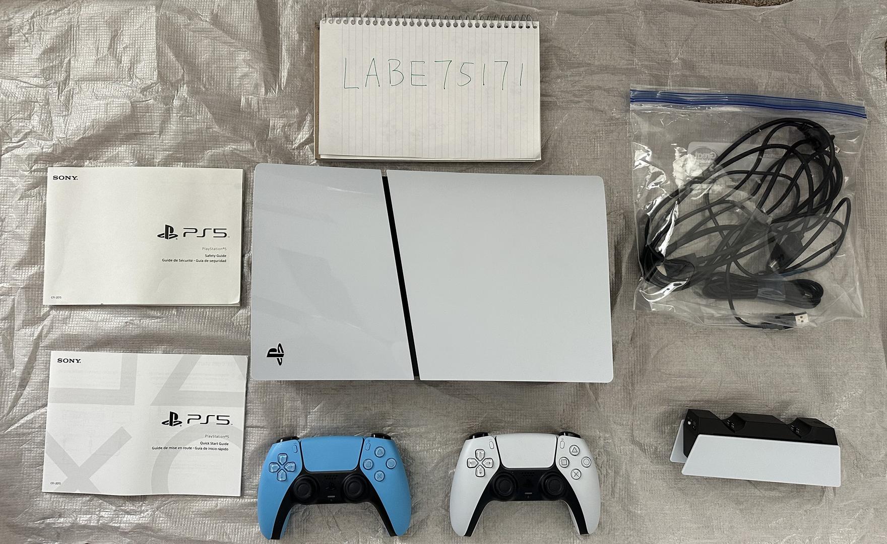 PS 5 Slim Digital Edition, with one extra controller (2 wireless controllers total) and one charging station, mint condition. Barely used. Bought from Amazon. Original packaging included. Fast shipping.
