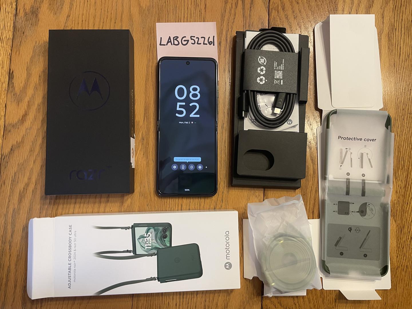 This is a brand new green Motorola Razr+ 2024 which has never been used. The box has been opened but the phone is completely unused. Also comes with adjustable cross body case in green.