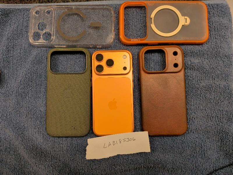 Lightly used 512gb cosmic orange iPhone 17 pro. A very tiny nick at the top. Can not see it with a case and comes with a few extra cases.
