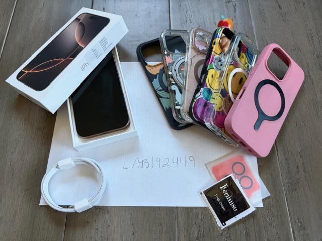 Mint condition Iphone 16 Pro 128gb Desert Gold phone. Was AT&T, unlocked after we paid it off. Has always been in a case with screen protectors. The camera cover is still on but I removed the screen protector, and I don't have another one to replace it. Comes with 6 magsafe cases. The back has a radiation blocking sticker, you can easily peel off if you don't care for it on.