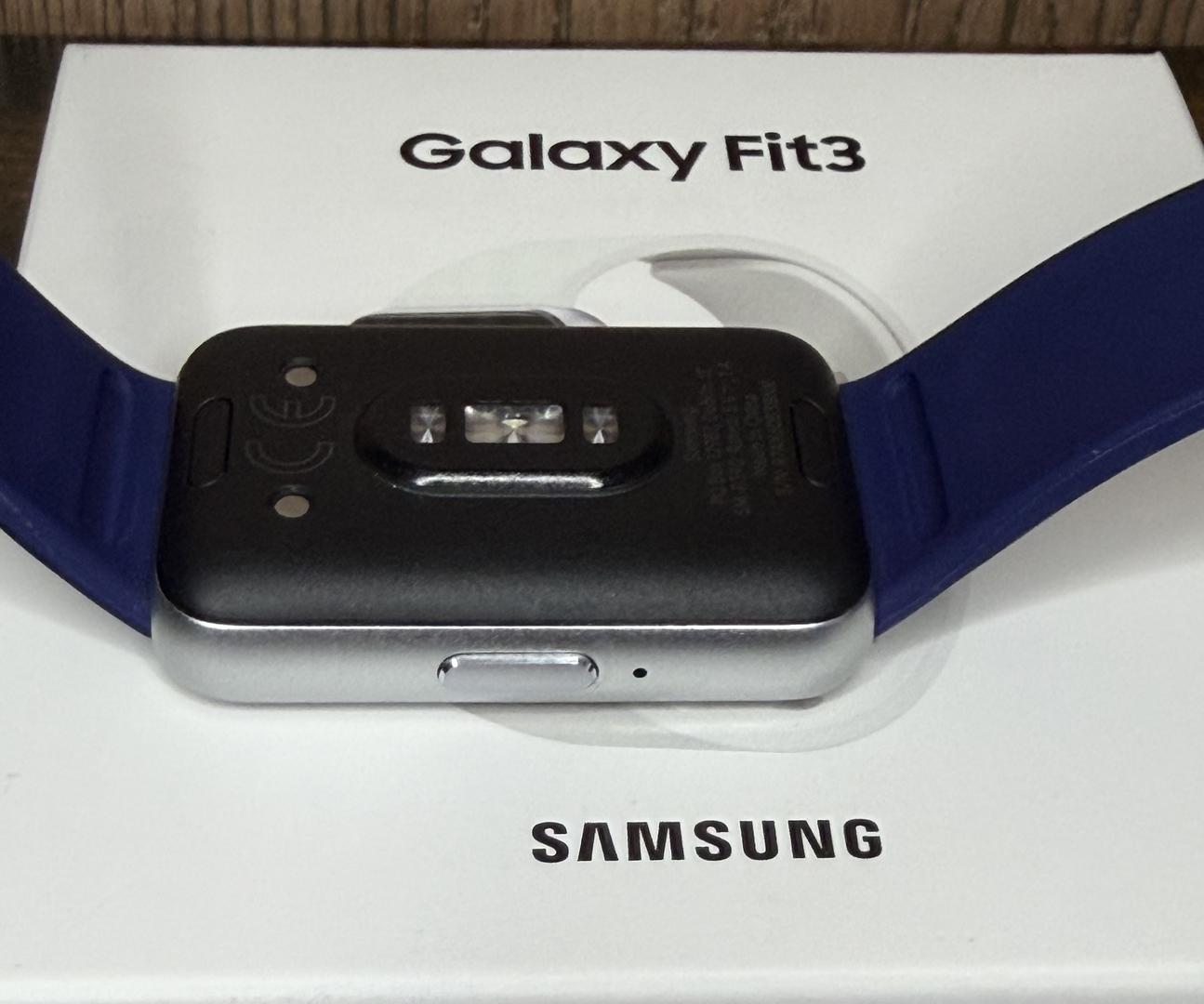 Galaxy Fit 3 in PRISTINE condition -- device has been kept in a protective case since purchase and has been seldom worn (please review pics as they're also part of the description). Comes with its original box, charger, three additional watch bands (black, Indigo (blue), and platinum), and four protective cases.