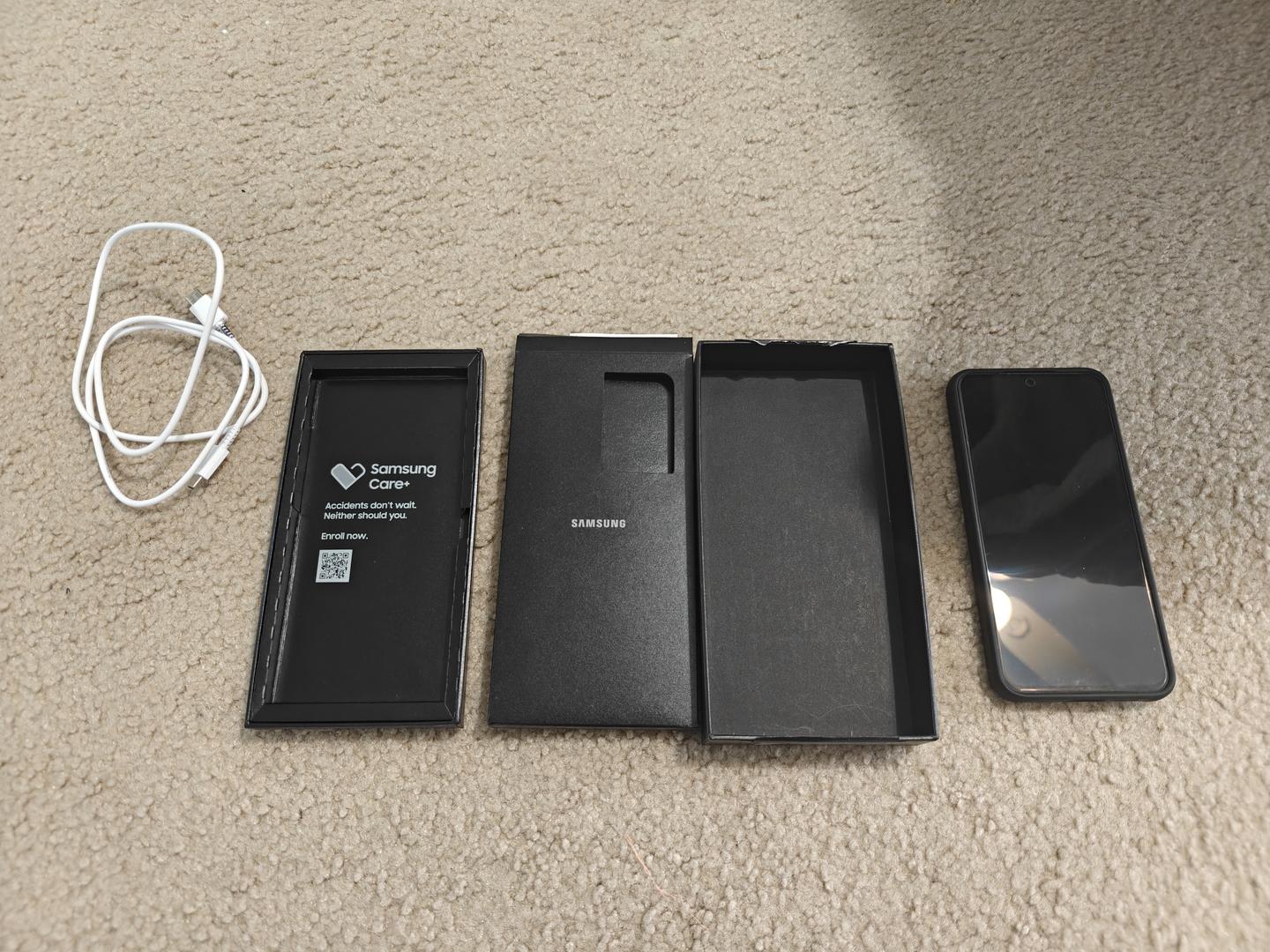 Phone is like new. Lightly used. Has a screen protector installed but you can remove it. Still has about 9 months of Samsung warranty left. Has a magsafe case and charging cable. 100% battery health.