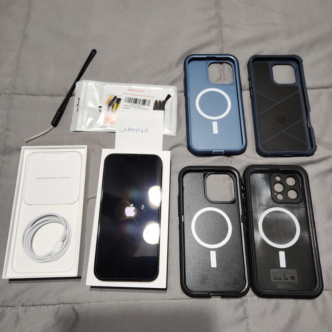 Mint iPhone 14 Pro Max with box, new OEM Apple battery at 100%, speaker grill protection, 4 cases