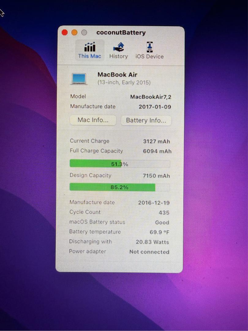Battery only has 435 cycles and still holds 85% charge.