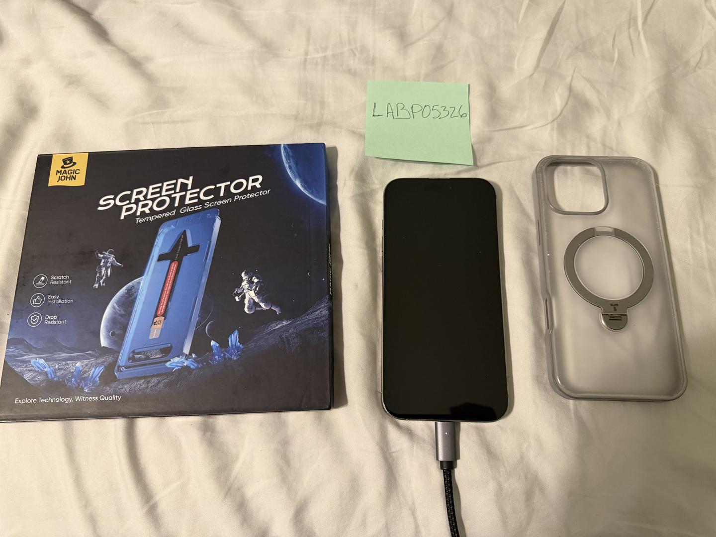 Phone has a flawless screen. It has been kept in a case. It may have very minor imperfections on the back and a bit of lint in the speaker holes, but no notable damage worth calling out. I debated calling it Mint-it's pristine. Comes with my extra Magic John screen protector (they're the best, and they came in a 2 pack) and Torras MagSafe case. You'll need your own USB-C Cable.