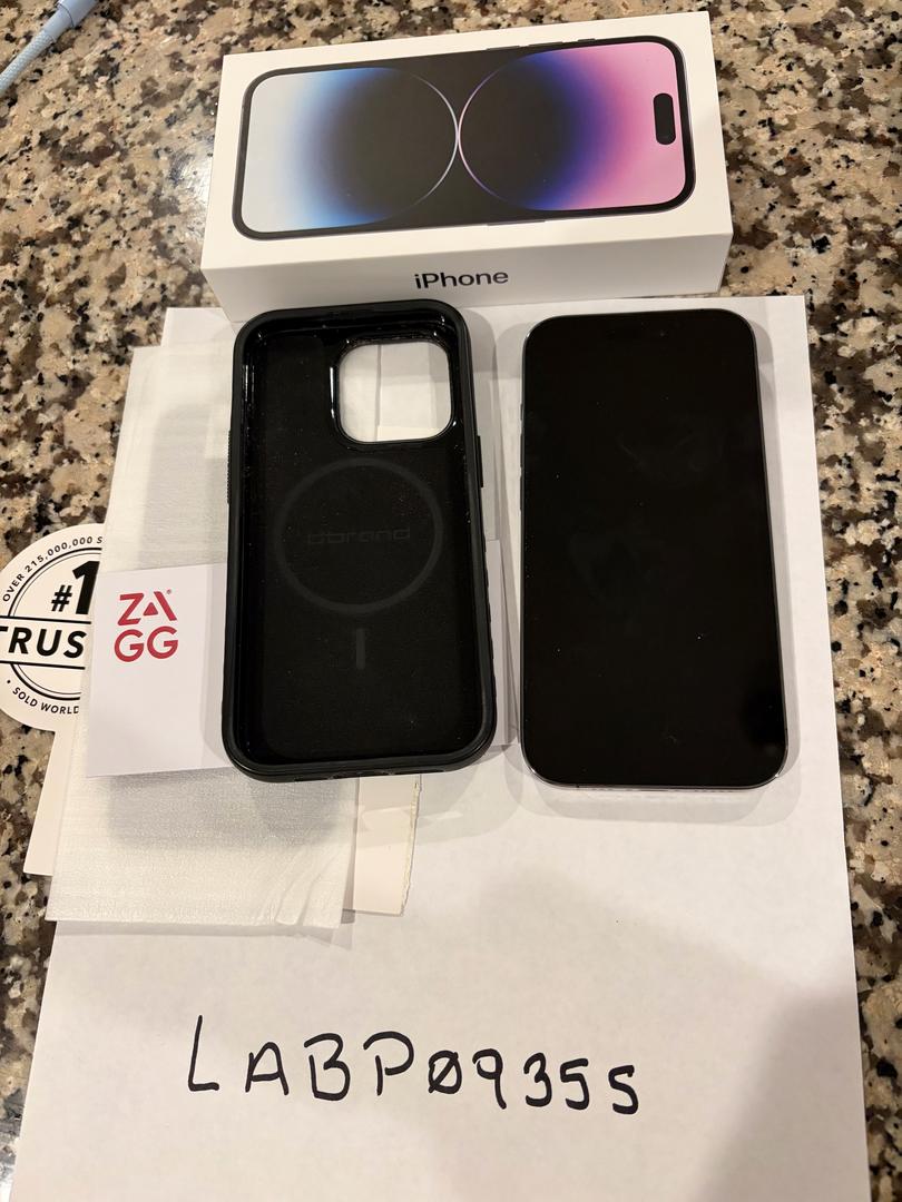 Used iPhone 14 Pro with 128 GB capacity in Deep Purple coloring. Device has had screen protector and case on since it was purchased and body is in great condition. Some light grooving of the metal ring is present on the rounded corners but otherwise the body of the device including the screen is in great shape. The battery was recently replaced by Apple using a genuine battery and the phone capacity is at 100%.