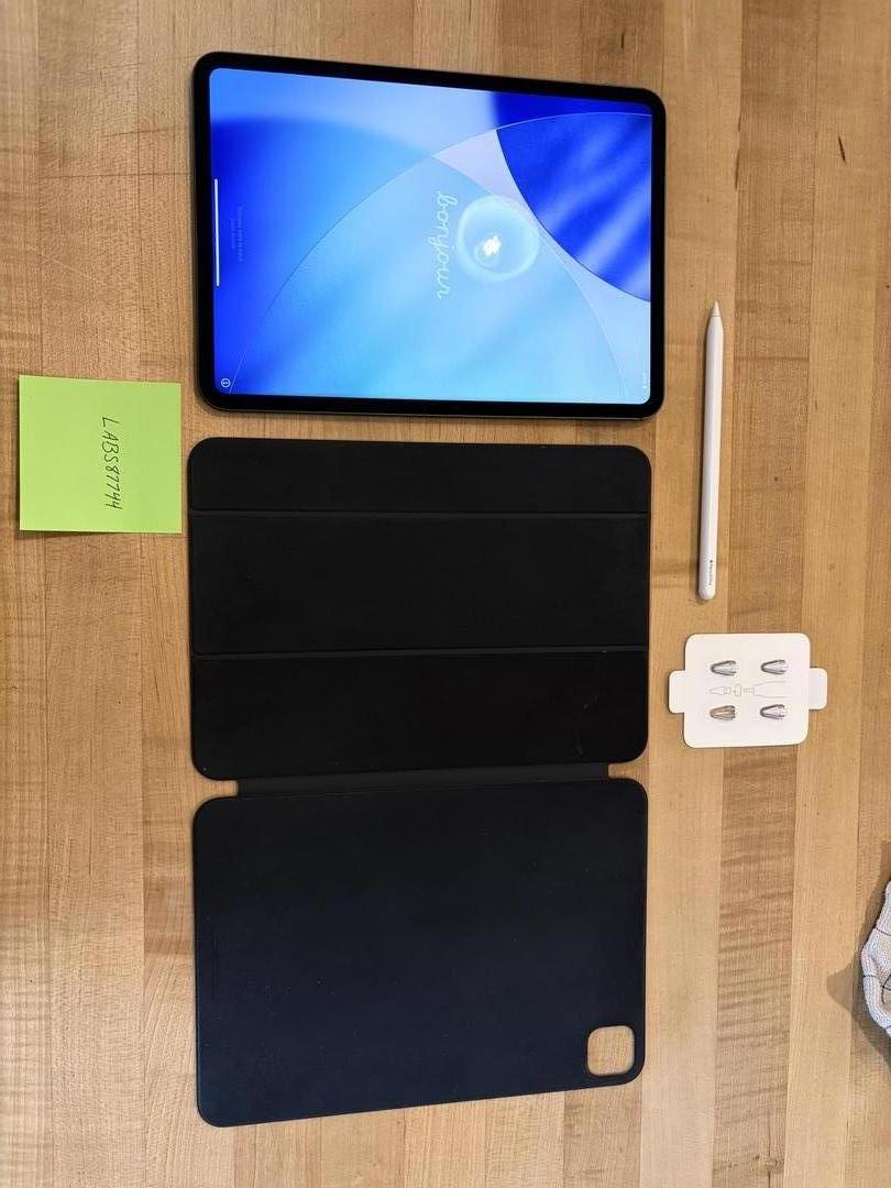 iPad pro 11” bundled with Pencil Pro, extra tips, and Apple Smart Folio. All items are in great condition, with 96% Battery Health on the iPad.