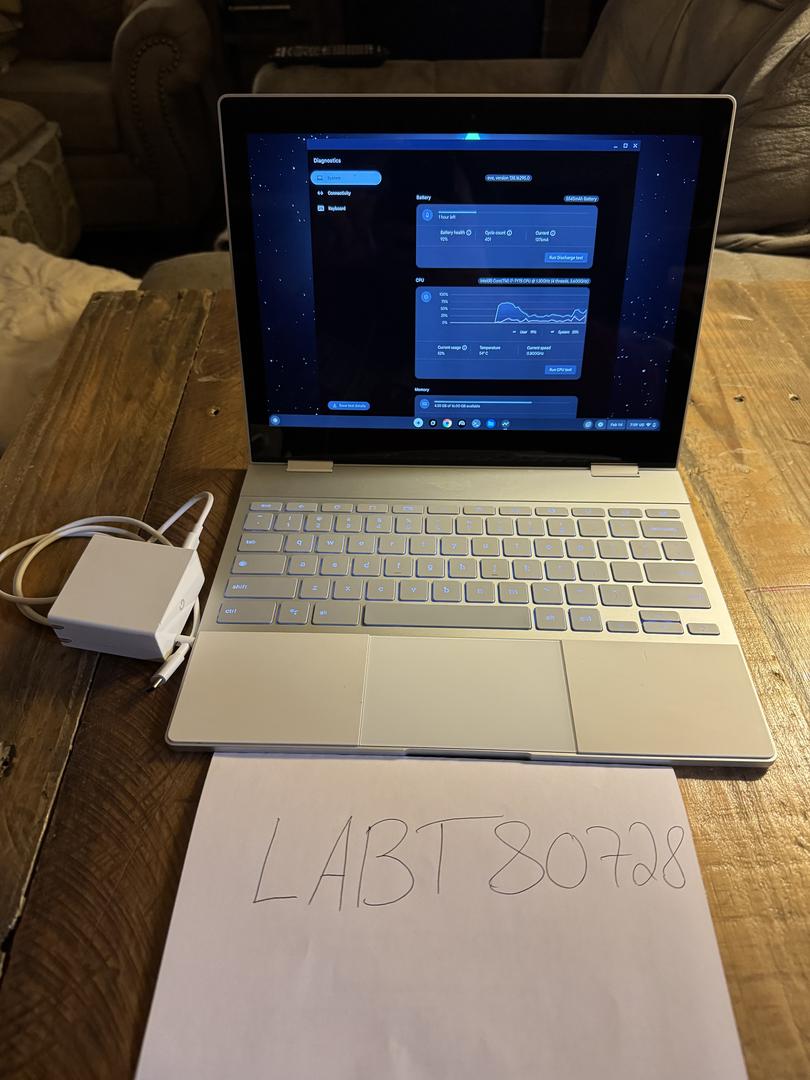 Pixelbook in good working condition, with minor signs of wear and tear from use. Battery health is at 92% with a 401 cycle count