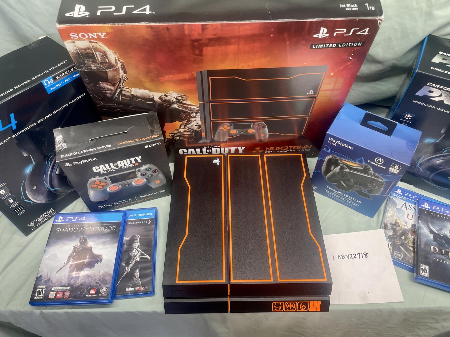 The Limited Edition PS4 Call of Duty Black Ops 3 console has a custom Jet Black box with vibrant orange accents inspired by by the dark intense world of Call of Duty Black Ops 3 featuring the iconic "III" logo. This represents the three primary unique game modes SOG Skull Campaign, Winslow Accord Faction Logo and the Mark of the Beast. This collector's console comes equipped with a massive 1TB hard drive for extensive game storage. Included are the original AC power cord, HDMI cable, Mono headset, Customized DualShock 4 wireless controller, Black Ops 3 DVD edition and associated paperwork.