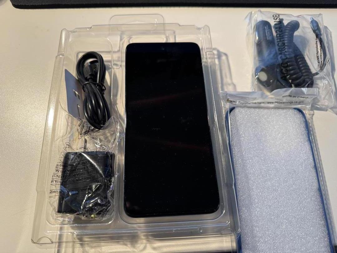 Comes with charger, cable, car charger and a case.