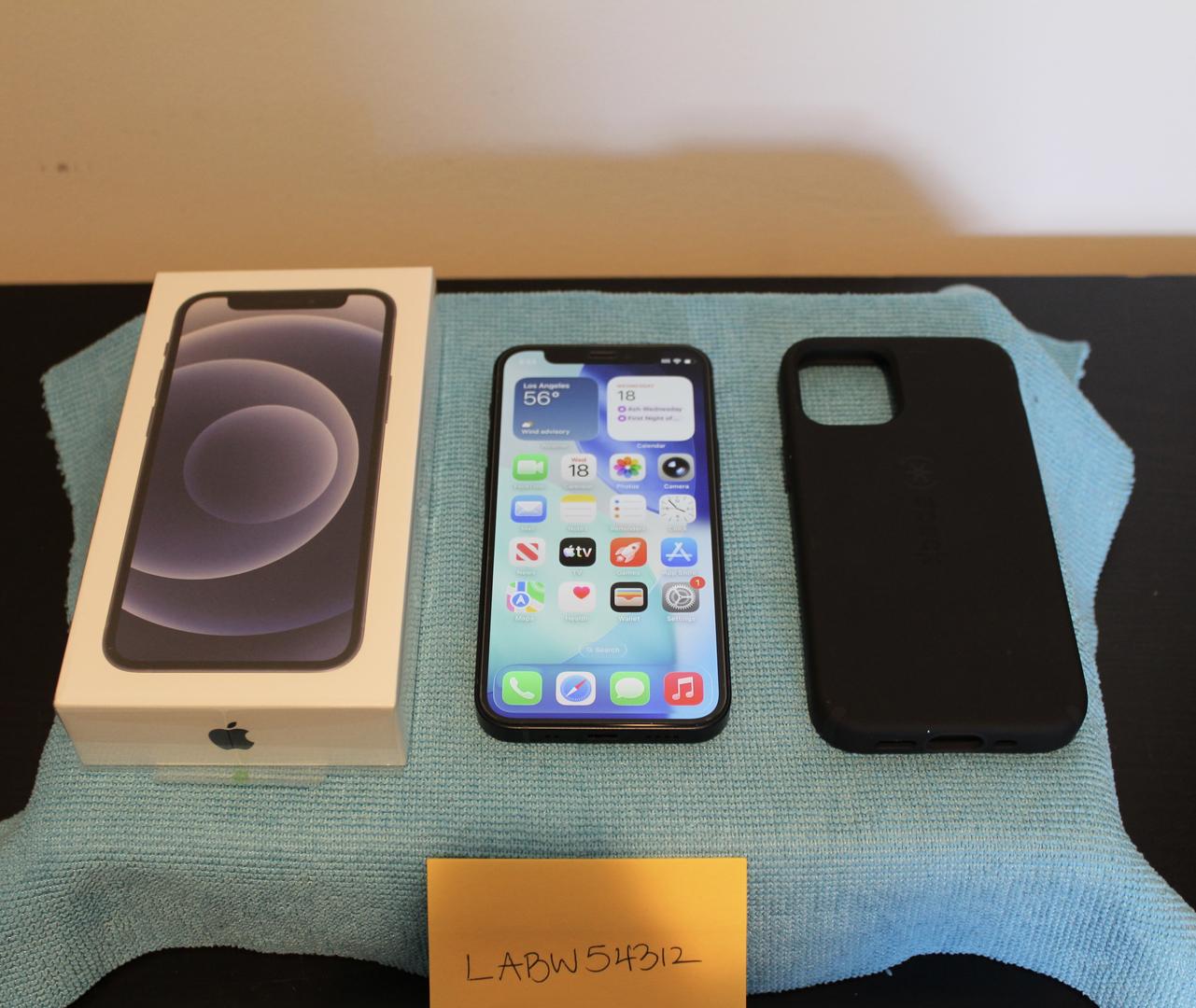 iPhone 12 Mini 64GB storage in black. Comes with box & USB-C to Lightning cable. Has a screen protector installed and comes with a Speck case. Apple Limited Warranty expires 12/16/2026. Battery health is at 100%.