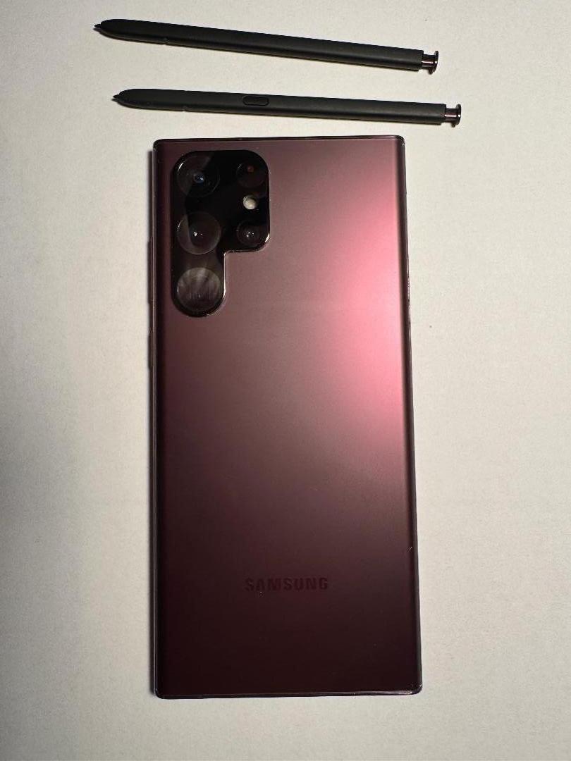 This Samsung Galaxy S22 Ultra with 512gB memory has been kept in pristine condition since it was new. The screen and camera lens have been protected with a durable cover from any scratches and the Burgundy casing is in equally excellent condition due to being in a custom fitted case. The quad-camera system has a 108mp wide sensor, 12mp ultra-wide, and dual 10mp telephoto lenses providing 3X and 10x optical zoom. It supports 100x Space Zoom, 8K video recording, and a 40mp front selfie lens. It has
