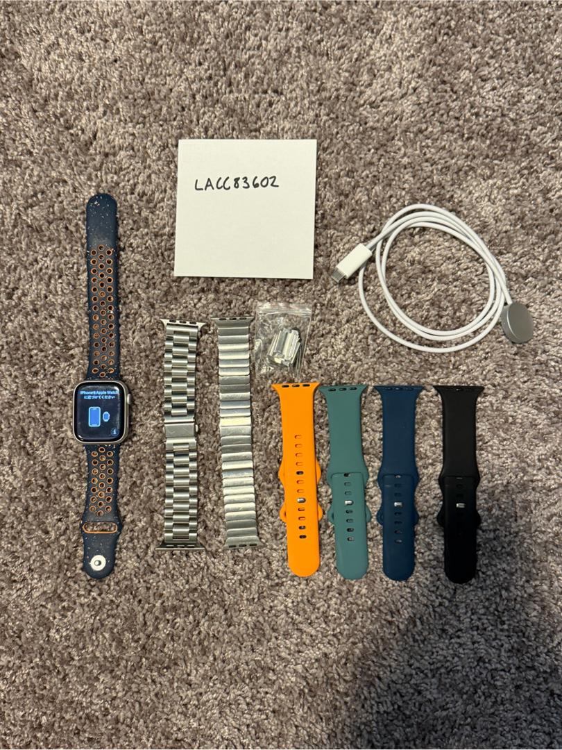 Purchased new in Nov 2023. Comes with original Nike sport band (M/L), charger, 2 aluminum bracelets and 4 silicone bands.