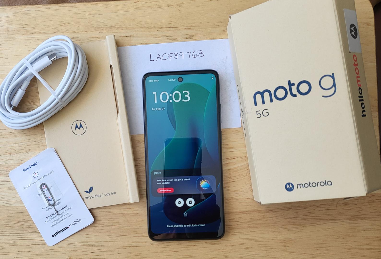 Never used carrier unlocked Moto G. No scratches or signs of wear. Comes with charging cord, Sim card key, original box and some paper work.