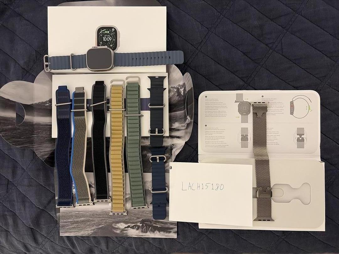 I’m selling my mint condition Apple Watch Ultra 3 with a collection of Apple bands and charging cable. Bands included are the Titanium Milanese Loop size M, Trail Loops (S/M) in blue, blue/gray and black, Alpine Loops (M) in tan and green, and Ocean Bands in Anchor Blue, navy and black.