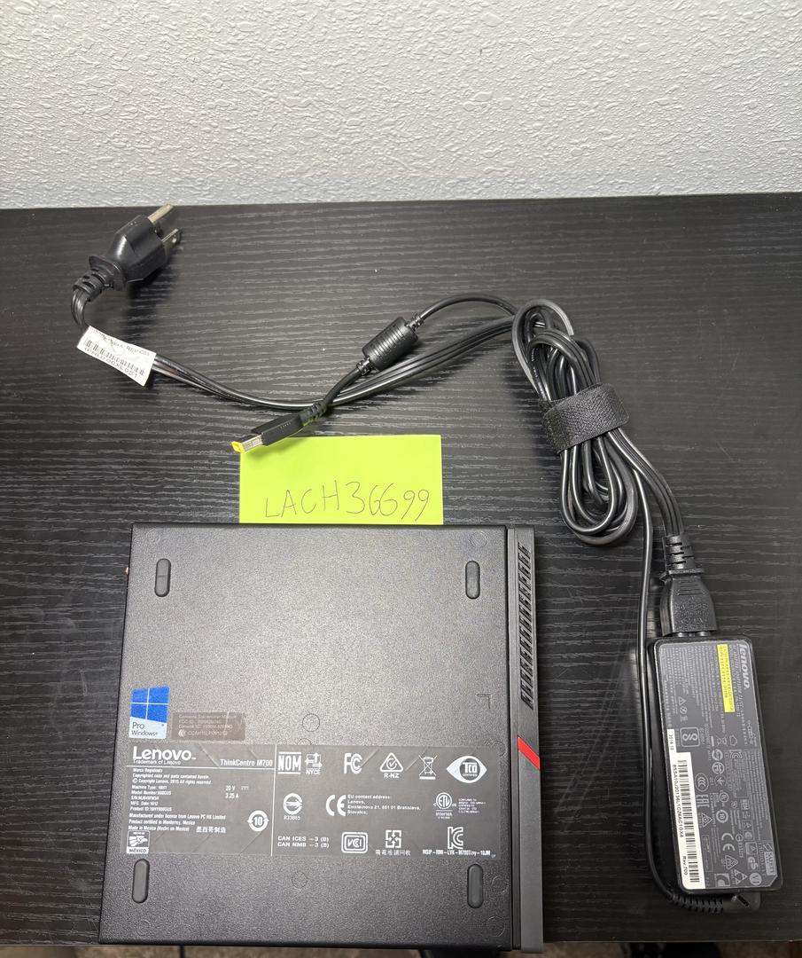 Lenovo ThinkCentre M700 with charger, 128GB SSD, 8GB RAM, and running Windows 11. Has 2 DisplayPorts, 6 USB ports, 1 Ethernet Port.