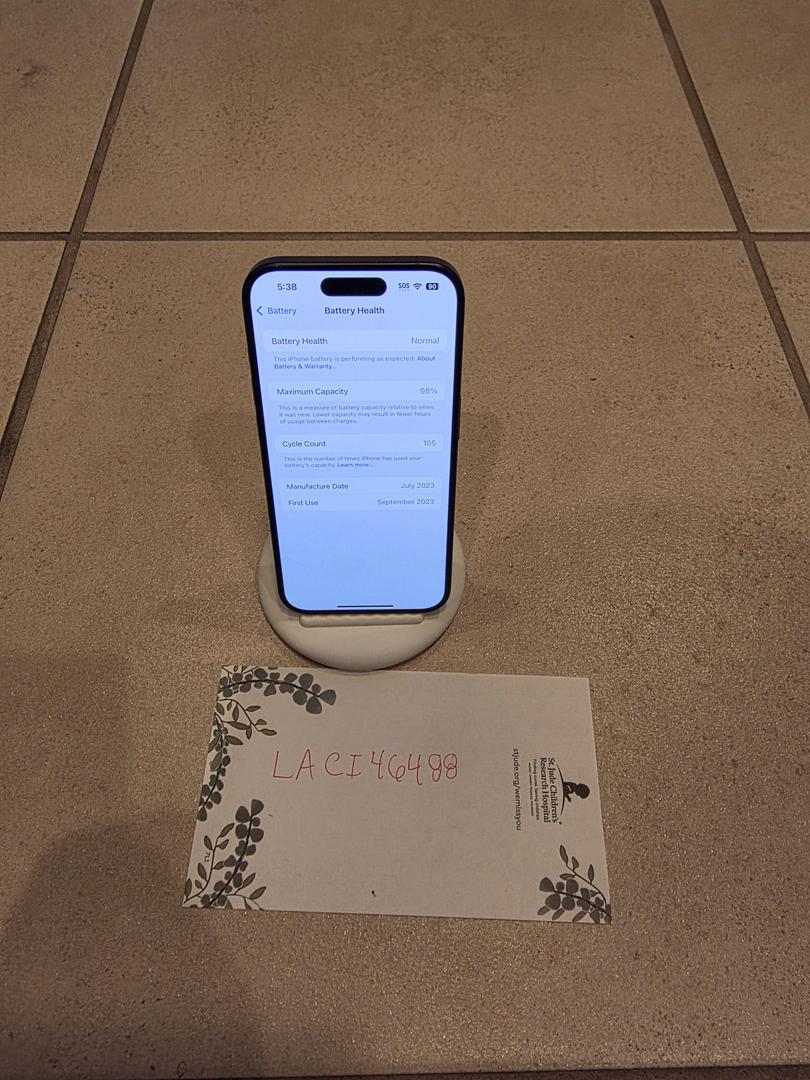 Blue "Titanium" iPhone 15 Pro. 128gb. Mint condition. No scratches, blemishes, scuffs. Battery level is 98%. Cycle count=105. This the best value"used" iPhone sold (Swappa Staff Pick for a reason). I ship super fast.