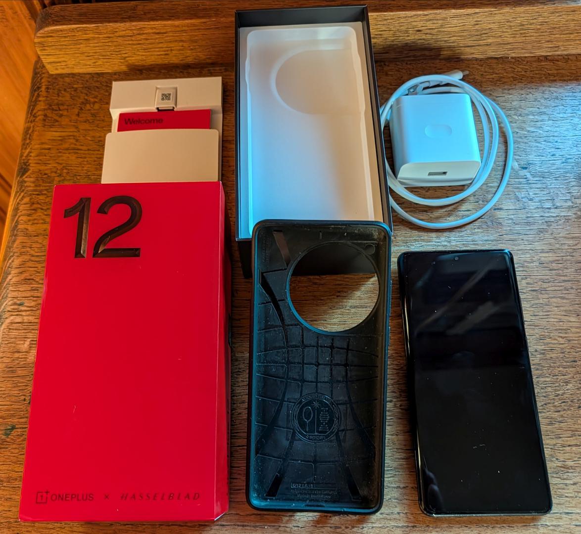 OnePlus 12 in very good condition. Any signs of wear and tear are minor and on the edges of phone. Includes 80W ultra fast charger, cable, original box, screen protector, camera protector and black case.