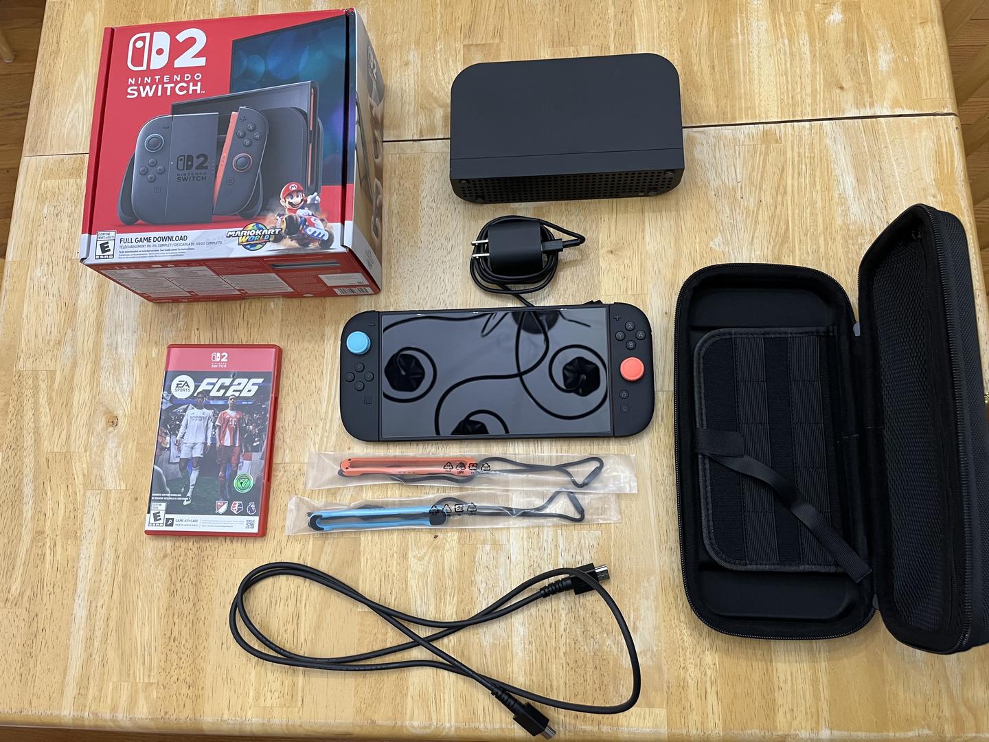Nintendo Switch 2 with all original box items (dock, charger, HDMI cord, Joy-Con straps, Joy-Con grip) shipped in original box. Screen protector included and installed when bought. Additionally, includes Joy-Con thumb grips, travel case, and FC26 game.