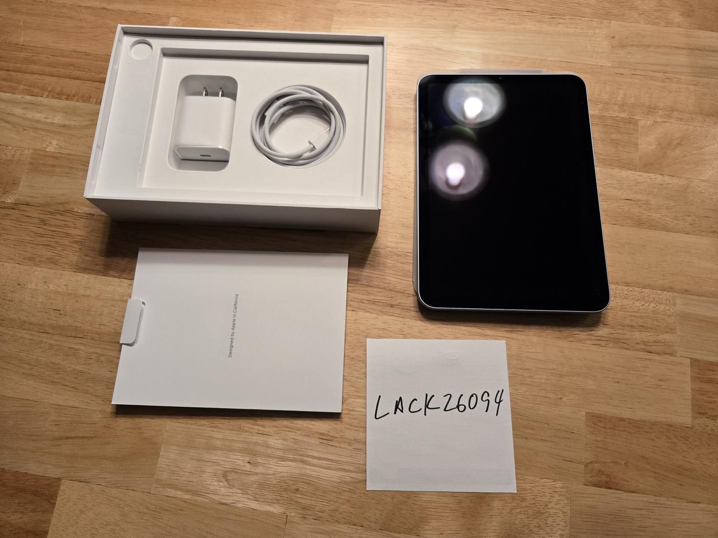 Like-New iPad Mini 7, Apple limited warranty through August 25, 2026. Includes original packaging and accessories. Battery health 100%.