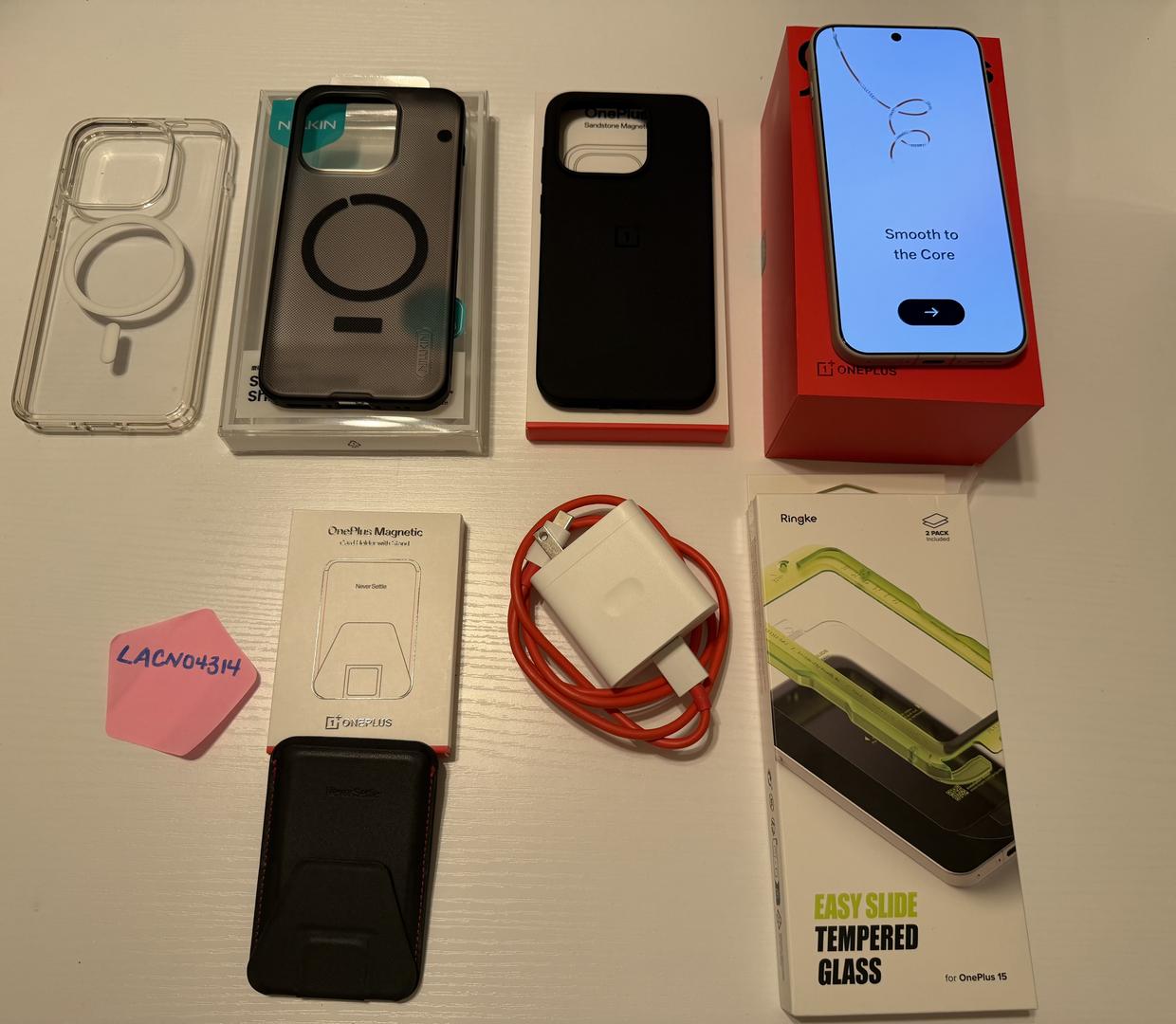 3 cases are included. The clear case does not have the box. It was only used a couple of times. The grey frosted case (Amazon) does have the box. It was used the most. The OnePlus case has the box and never used. Also included is a magnetic card holder with stand. It has the box and has never been used. The original box, papers and charger is included.