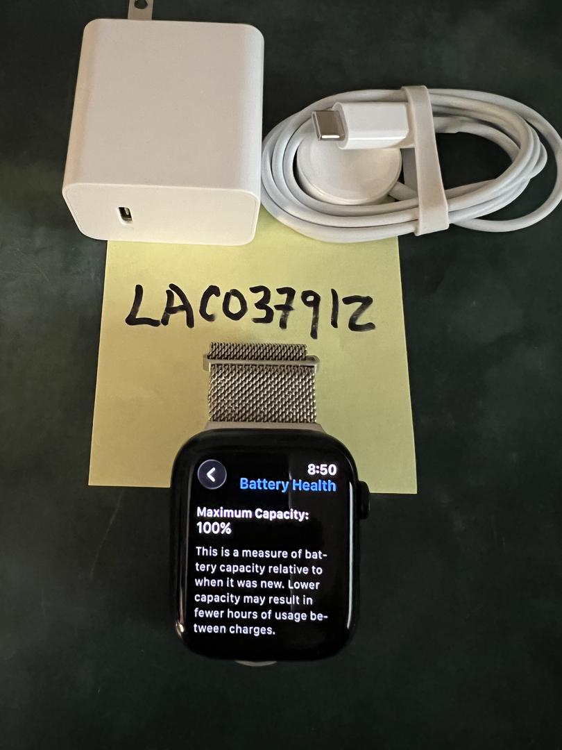This was my primary watch for several years. Though showing normal wear and tear, it has a noticeable small scratch in the upper left corner that does not affect the ability to see everything clearly. It has a self-healing screen protector. When the battery health percentage dropped to 79%, I replaced it with a new battery from iFixit, then charged it for more than 2 hours until it hit 100%, then discharged it, then charged it again to 100%. It's a clean, perfectly functioning watch running the latest watchOS. In addition, it comes with a silver milanese loop band, a charger and a plug in adapter.