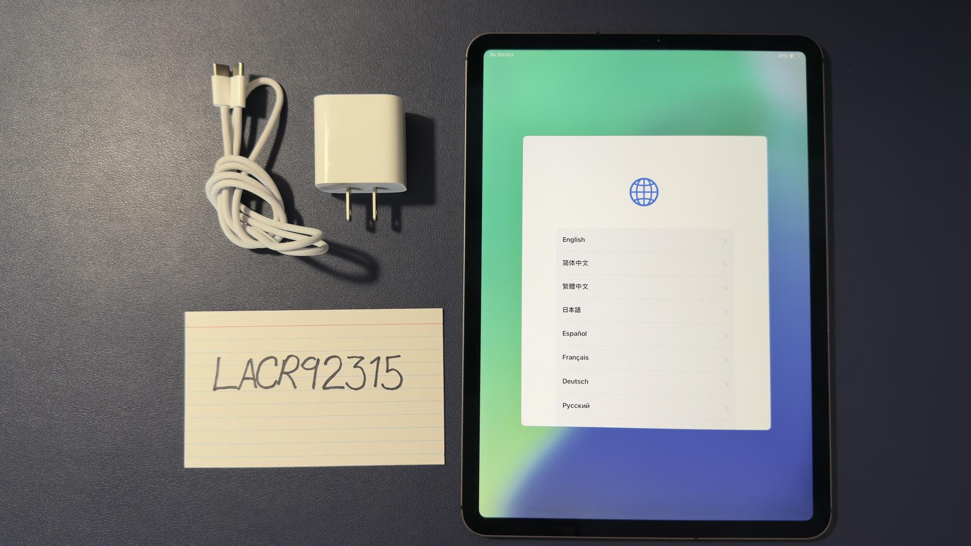 iPad Pro 11" (2018), Gray, 256 GB with Apple USB-C wall adapter and Apple braided power cable.