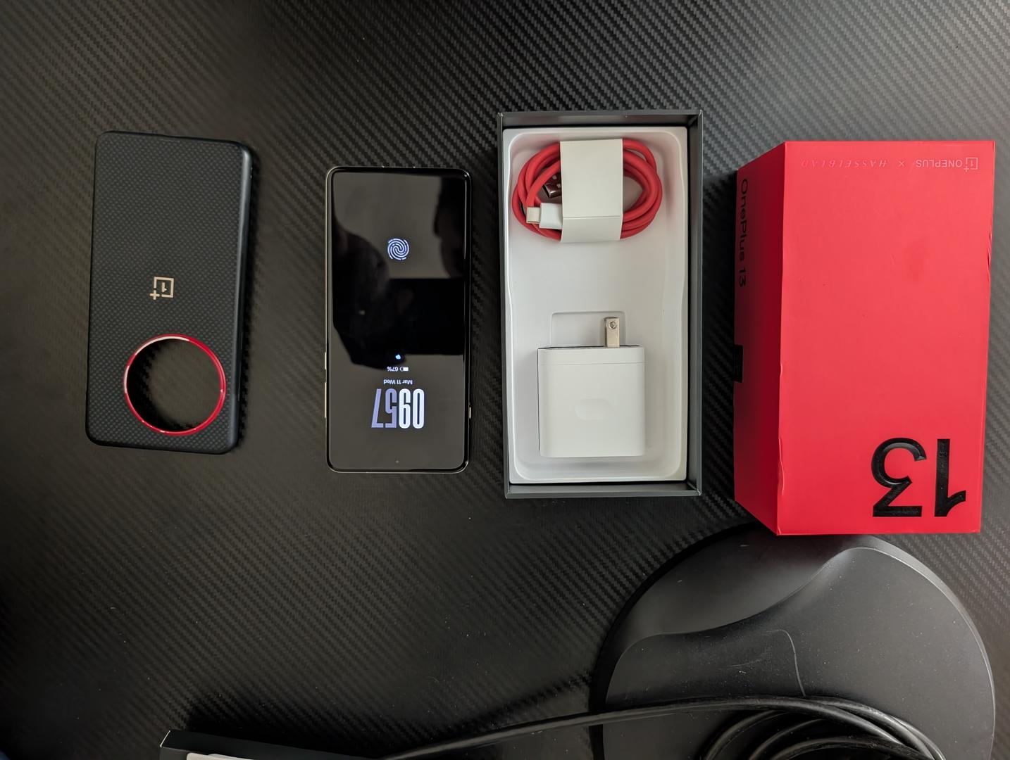 OnePlus 13 that comes with box, original charger, and original blue OnePlus case.