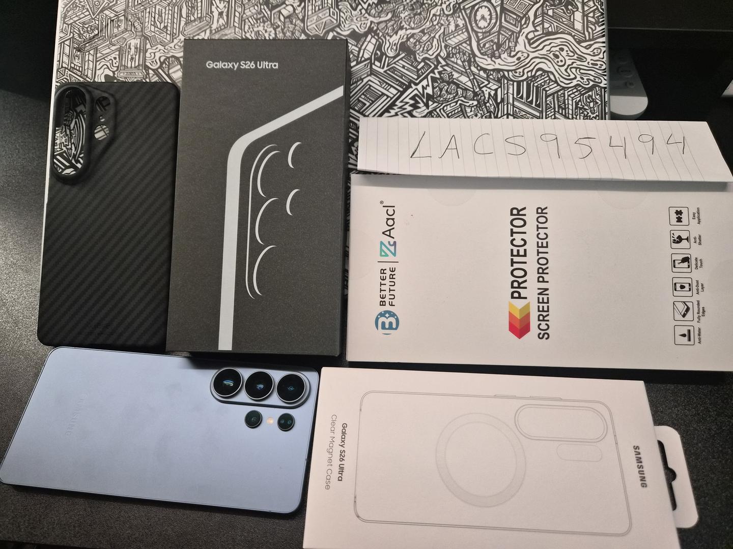 Comes with samsung clear magnetic case and screen protector installed (2 extra) and a carbon fiber case.