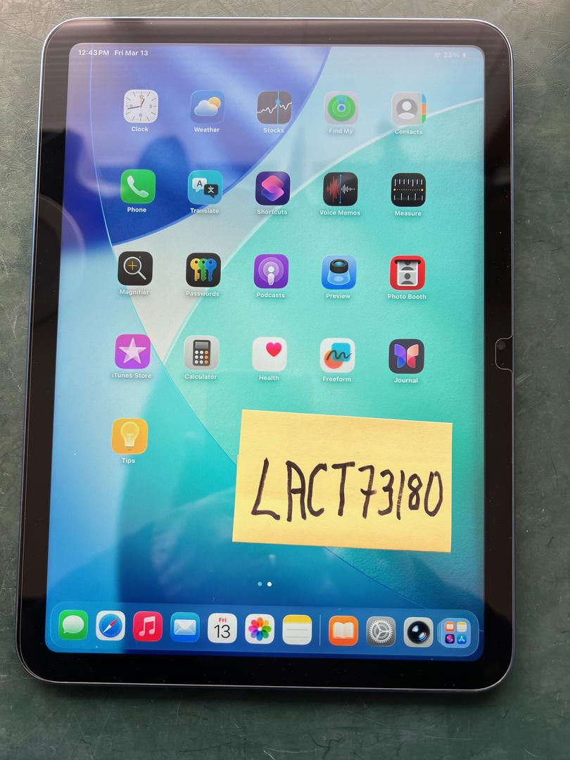 This iPad 10th gen. shows normal wear and tear and is in Good condition cosmetically. The battery is new and was manufactured March 1, 2026. This model of iPad is somewhat unusual in that the digitizer and display are separate, not laminated into one unit. The battery installer said that made for a fiddly replacement process. Since he was not working in a clean room, there’s one tiny speck of dust in the bottom left corner underneath the row of icons. You don’t notice it unless you know where to look and it doesn’t affect anything except my peace of mind.
