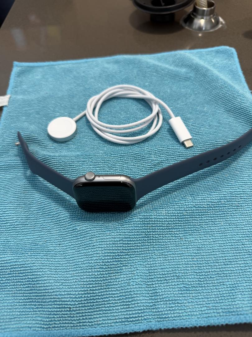 Barely used open box mint Apple Watch Series 11 Space Gray (46MM, GPS) - includes OEM charging cable and M/L Anchor Blue Sport Band. Battery is at original health of 100%