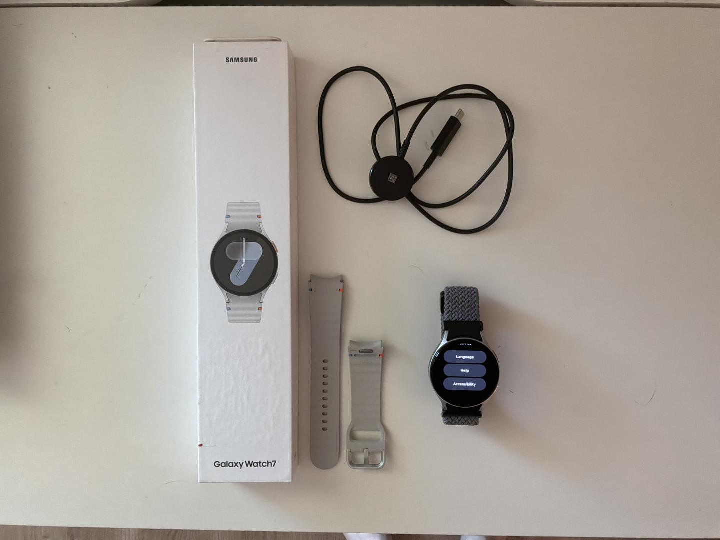 Selling my Samsung Galaxy Watch7 44MM in Silver. Comes with original packaging, USB-C charging cable, original wrist strap, and woven gray wrist strap.