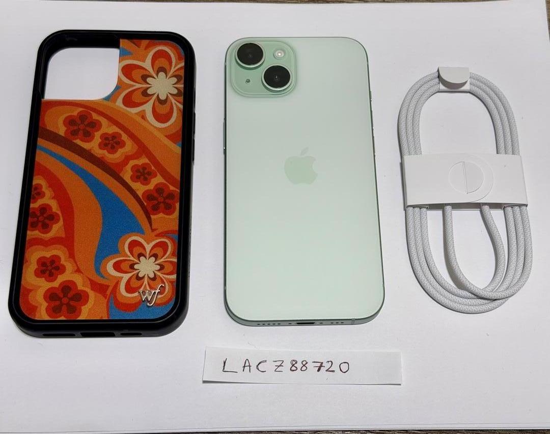 iPhone 15 Unlocked - Great condition, 88% battery with WildFlower case, and a brand new Apple cable